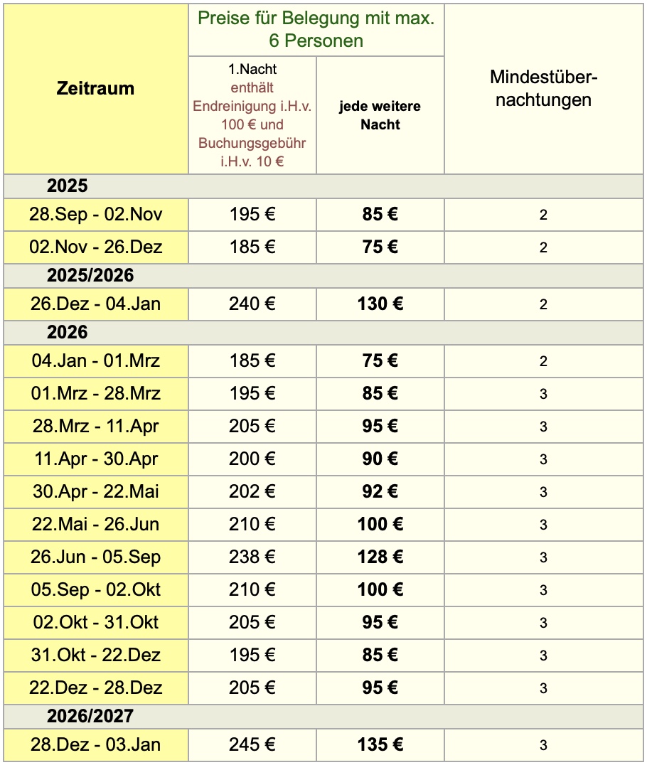 Haustiere: Haustiere sind nur nach vorheriger Absprache erlaubt. Für Schäden durch Haustiere haftet der Gast.